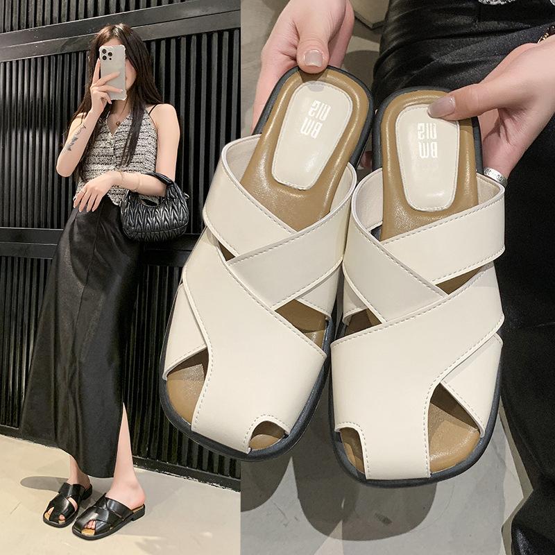 Prodyšné pantofle dámské letní nošení poloviční patka chladné pantofle líné měkké klopání dobré nošení kožený povrch duté protiskluzové černé