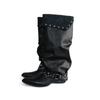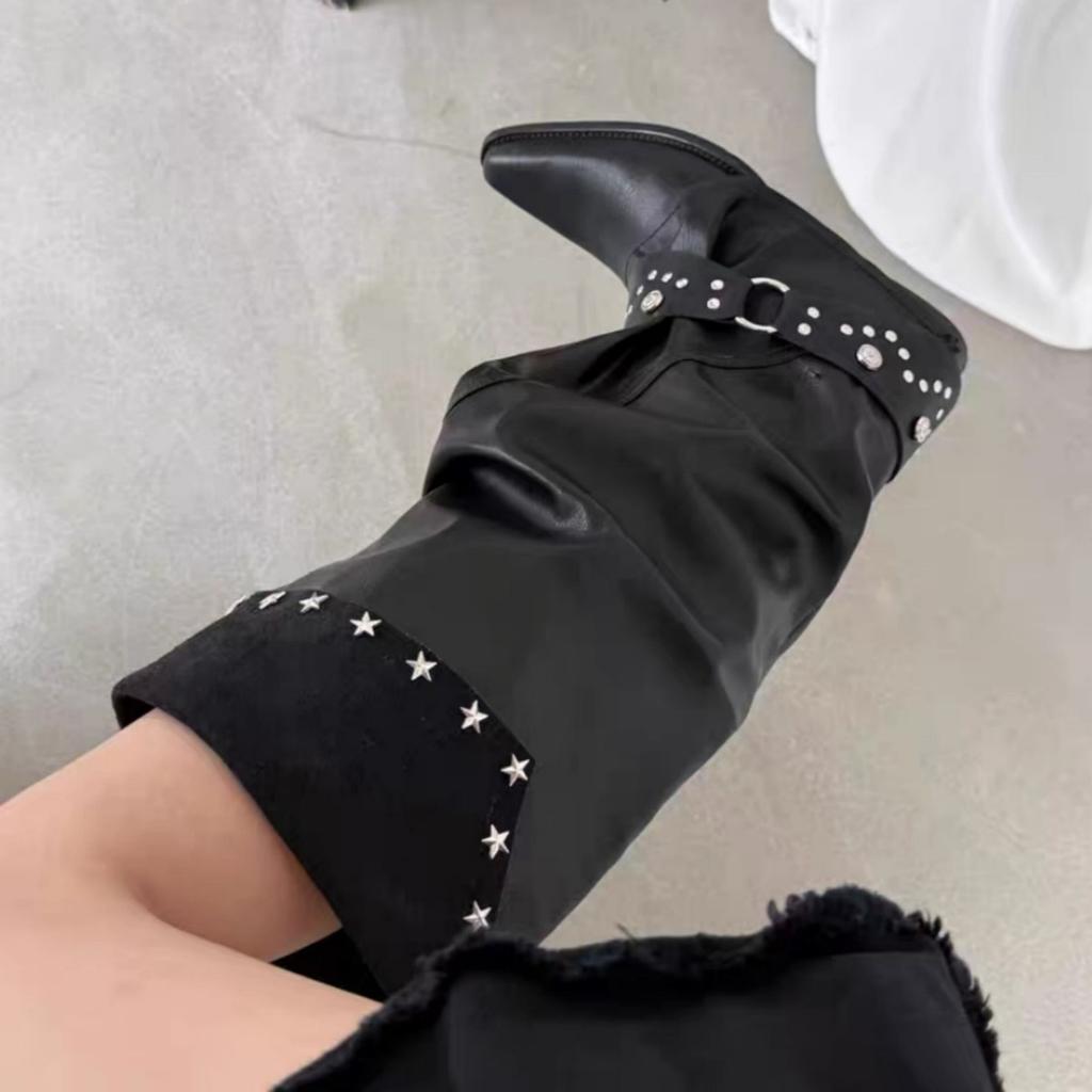 Cowhide version retro niche design sense pants boots long boots women pointed thick heel hottie black pleated pile boots
