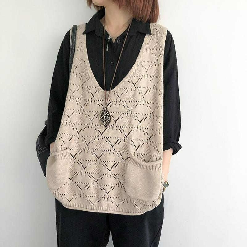 V-neck Rhombic Knitted Vest Women's Spring and Autumn Loose Outer Wear Hollow Sweater Vest Casual Sleeveless Vest