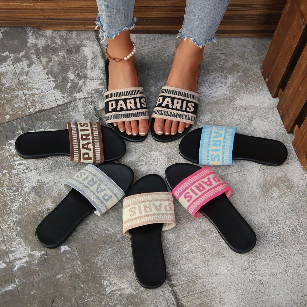 European and American sandals women summer wear new fashion embroidery letter embroidery home big leisure flat bottom one-word slippers foreign trade