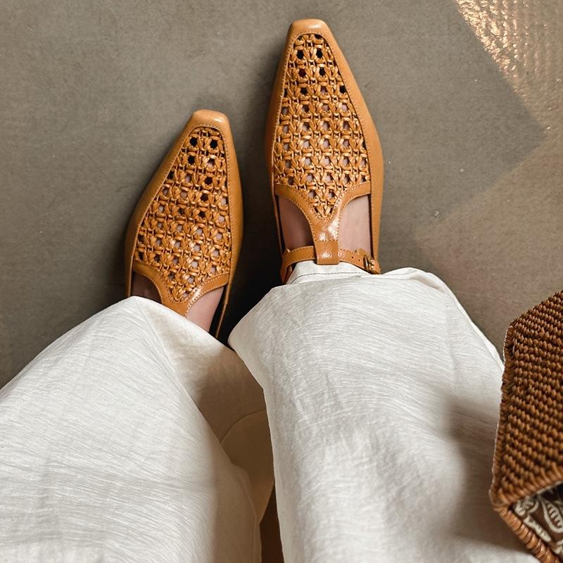 Hollow sandals woven low heel 2025 T-strap Mary Jane shoes women's new leather soft sole versatile thick heel single shoes