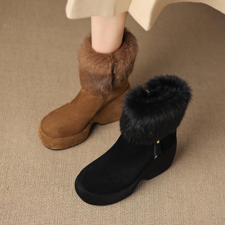 Rabbit fur cotton shoes autumn and winter new women's short boots 2025 fashion round head velvet warm waterproof table slope high heel