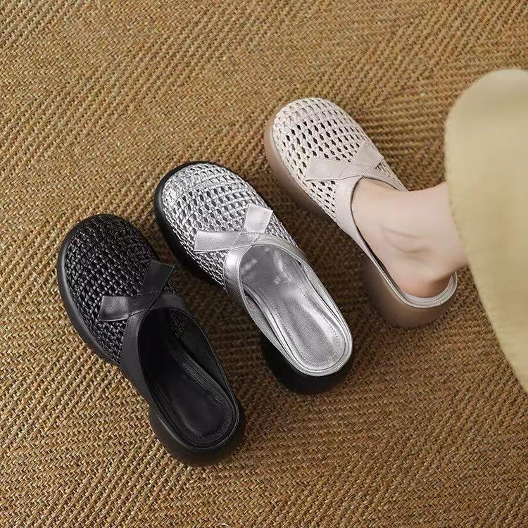2025 summer new woven hollow thick-soled bag head rear empty slippers wear high-heeled muller shoes fashion shoes women's slippers
