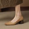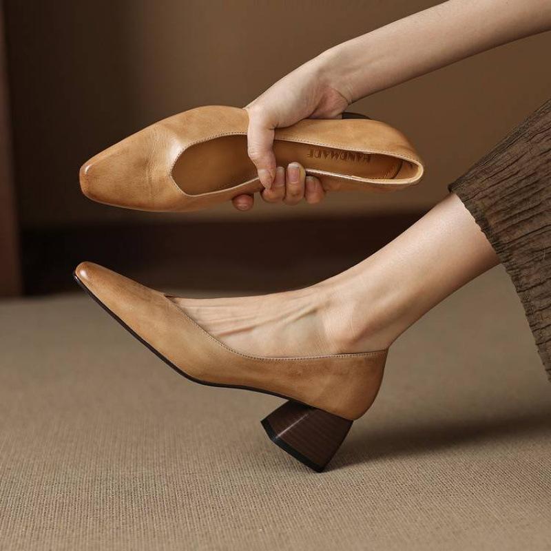 New women's thick heel large size women's shoes casual solid color leather square head single shoes one pedal four seasons wear cowhide single shoes