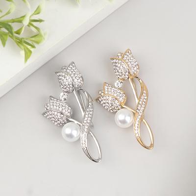 Luxusní Perlové Tulipánové Květinové Brože s Kamínky Pro Ženy Elegantní Kovové Fixní Špendlíky na Oblečení Denní Vysoce Kvalitní Šperky Svatba Dárek