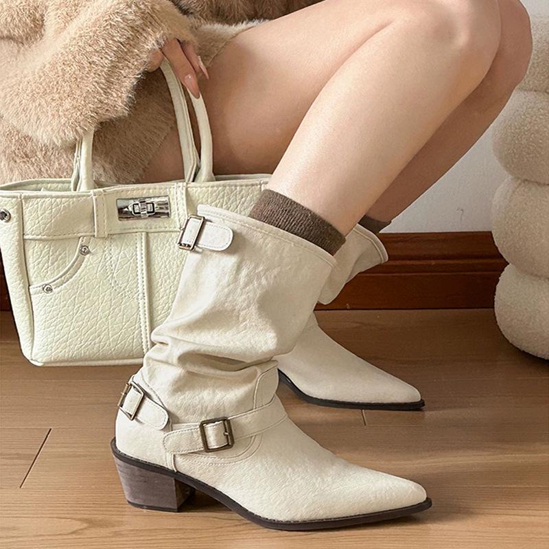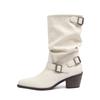 Pointed cowhide version thick heel white short boots women's 2025 new British style belt buckle Martin boots temperament medium tube pile