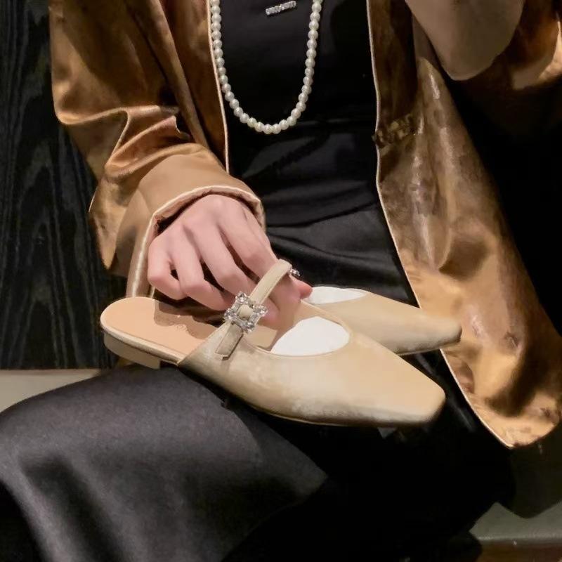 Grape mother of the same style~ Versatile French square head diamond buckle with low heel Muller bag head half slippers women's outer wear