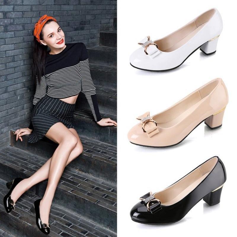 Rhinestone high heels women's autumn new round head shallow mouth bow single shoes thick heel versatile professional women's shoes