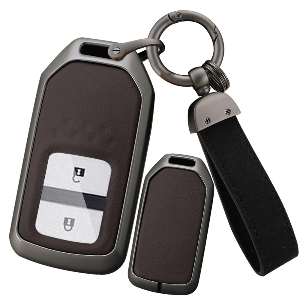(High Quality Material) Made of high-quality aluminum alloy and PU leather material, the multi-layered construction reduces impact from drops, and provides high protection for your car smart key. The buttons of the key case are made of a transparent matte film, so the buttons are clearly visible and fingerprints are not left behind. The clever combination of PU leather material and metal creates an elegant and fashion piece. The combination of three classic colors and metallic colors will give you a new feeling and become more stylish and eye-catching. It is dustproof, shockproof, and has a luxurious finish. Protect your important smart key from scratches, dirt, etc