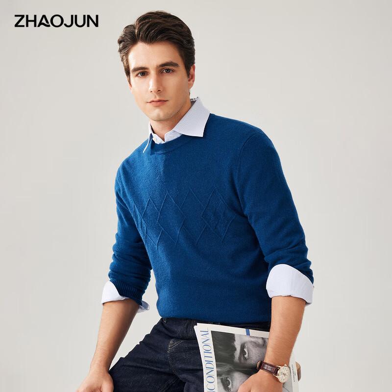 Zhaojun Men's 100% Cashmere Round Neck Diamond Pattern Sweater