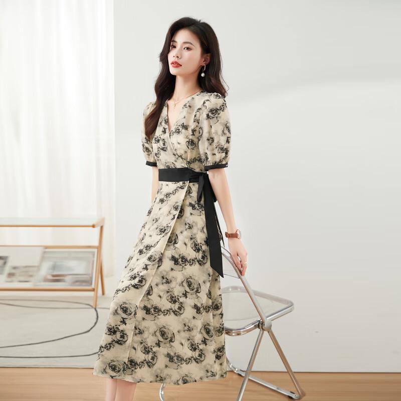 Iveni Tied Rose Print V-Neck Chiffon Dress