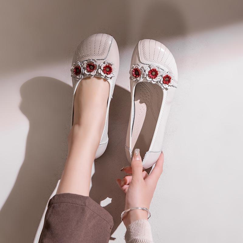 Leather mother shoes beef tendon flat heel shallow mouth round head medium and old flower dancing single shoes women