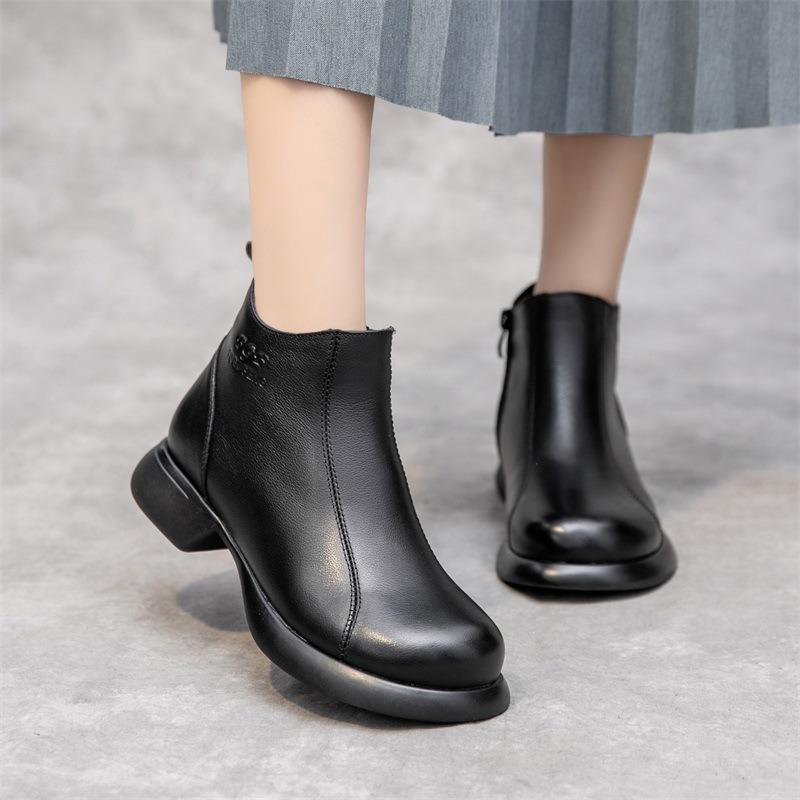 Leather thick heel soft bottom soft surface short boots children's autumn and winter retro round head large size velvet warm women's leather boots