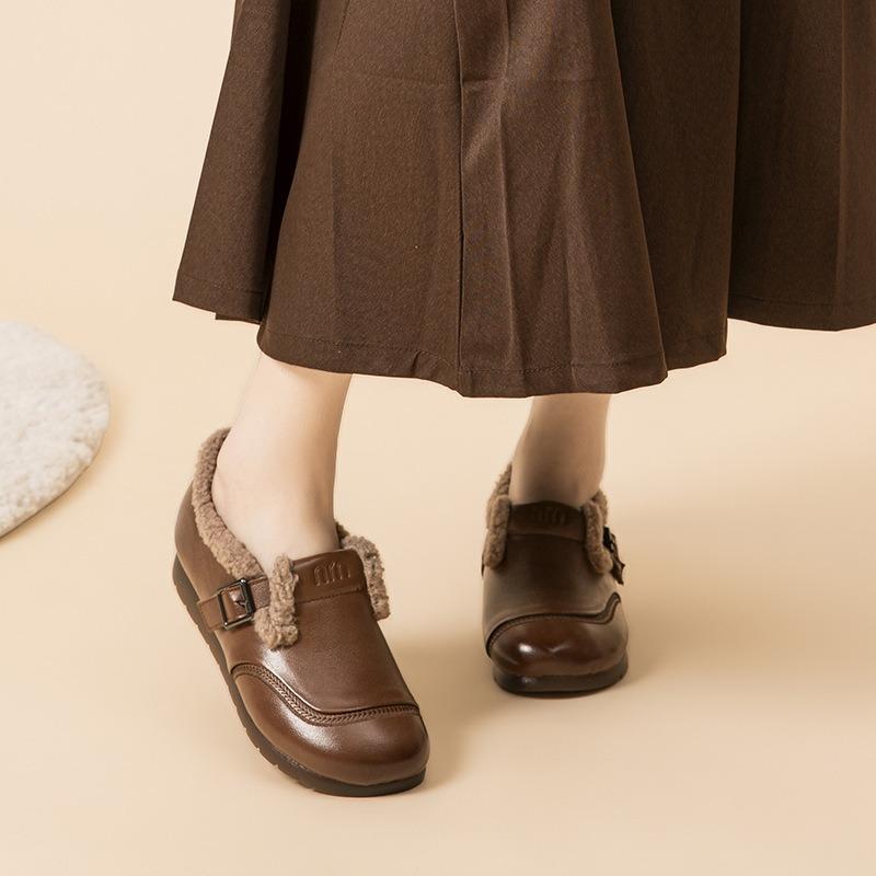 Leather wool shoes women wear casual lamb wool flat heel beef tendon sole middle-aged mother velvet cotton leather shoes in winter