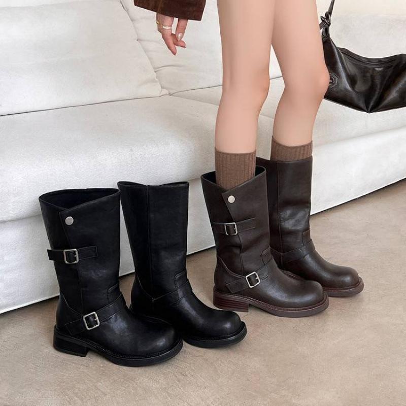 Autumn and winter leather women's boots solid color sleeve middle heel round head large tube circumference versatile large size leather boots medium