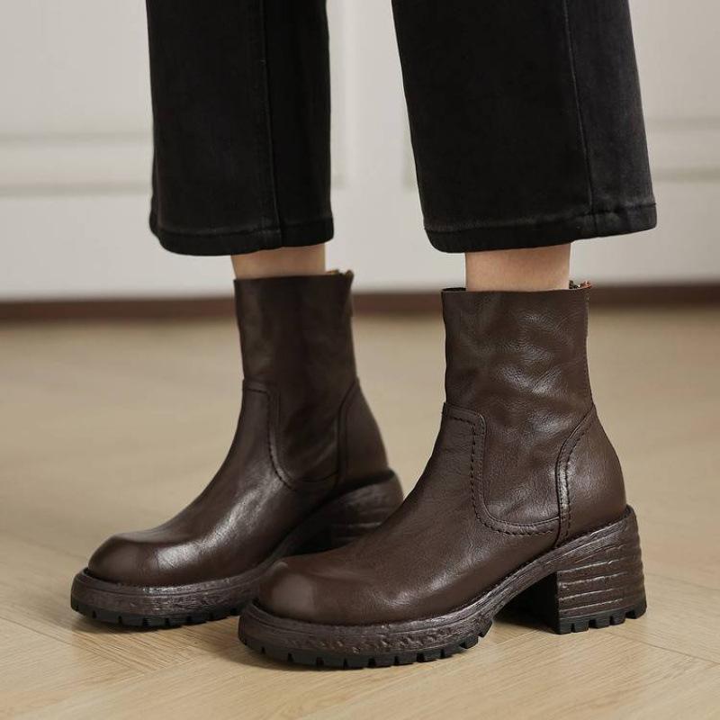 Autumn and winter leather Martin boots solid color medium heel round head versatile large size women's boots cowhide zipper medium tube women's l