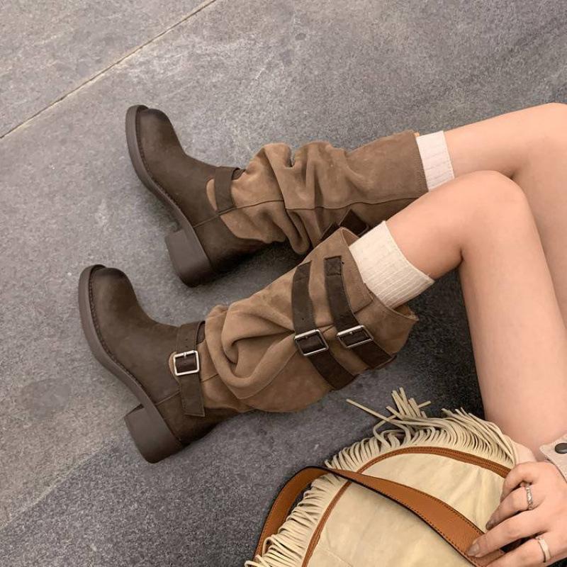 Autumn and winter big tube circumference Martin boots solid color leather women's leather boots medium heel round head new square heel versatile hig