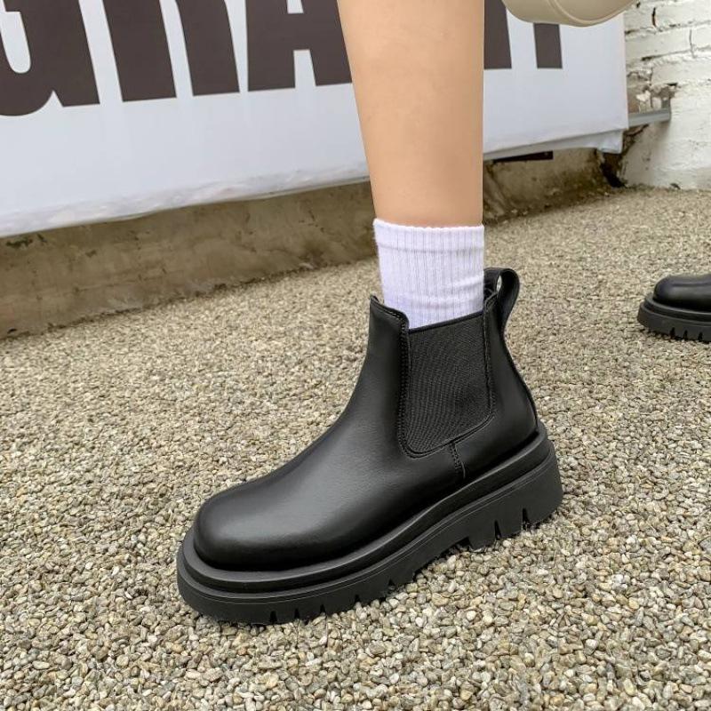 Autumn and winter round head solid color large size medium boots medium heel thick-soled leather boots sleeve non-slip women's boots new Martin boots