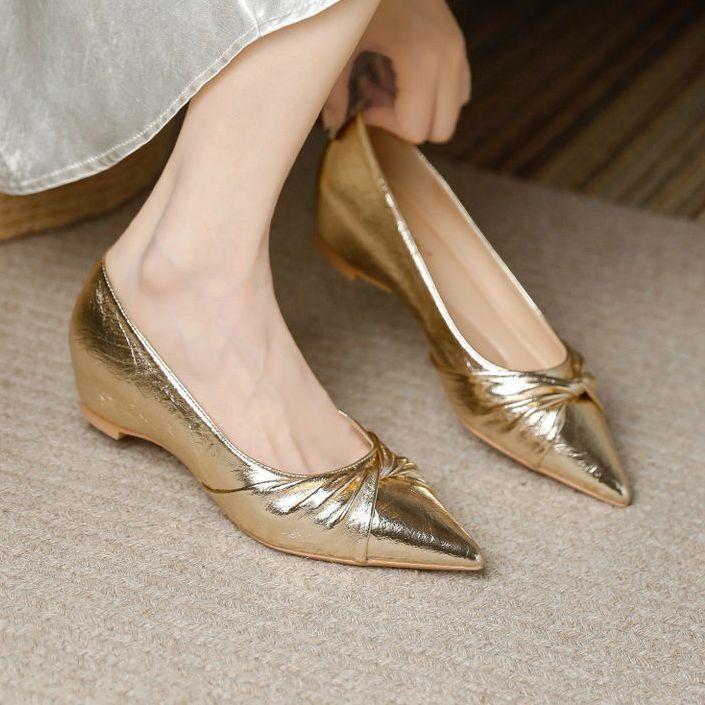 Gold heightening pointed flat-bottomed high-heeled single shoes, women's shallow mouth is versatile, and the foreign style is versatile. The skirt