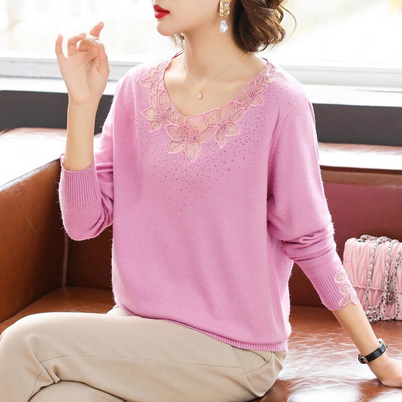 Dámský pletený svetr s dlouhým rukávem a výstřihem do V