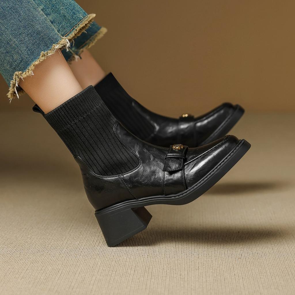 Soft leather round head huge comfortable knitted socks and boots women's 2025 new thick-soled versatile short boots plus autumn and winter velvet