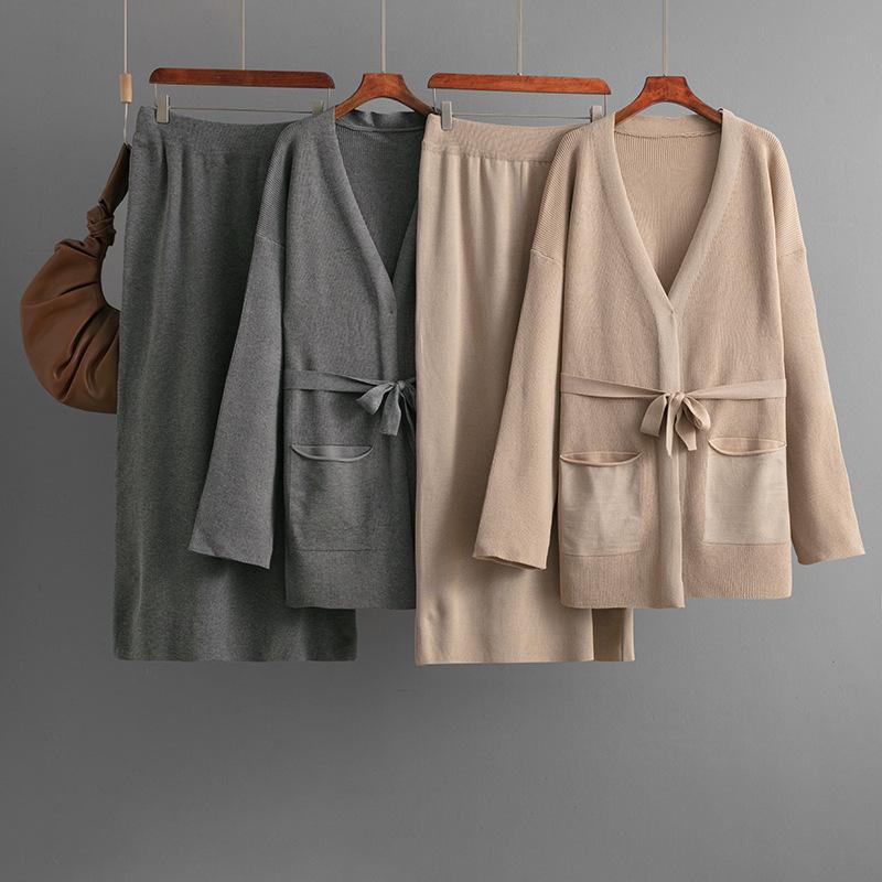 A Two-piece Fashion Suit for Women's Autumn and Winter, Featuring A V-neck Loose Knitted Lace-up Cardigan, Jacket and Skirt