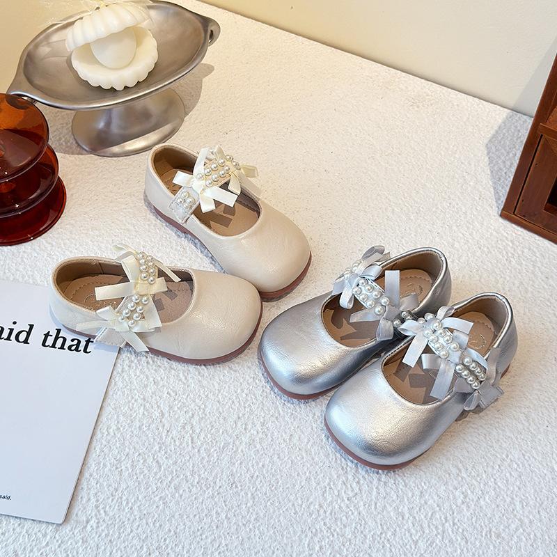 Girls leather shoes 2025 new children's pearl bow princess shoes girls show single shoes soft-soled Mary Jane shoes