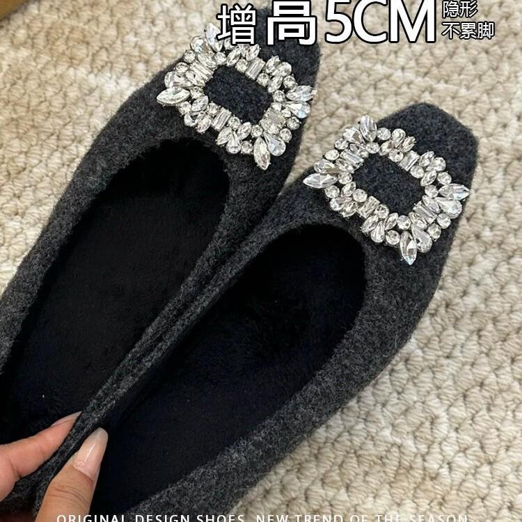 Invisible height increase of 5 cm Korean niche fairy shallow mouth rhinestone woolen single shoes femininity winter wear woolen shoes