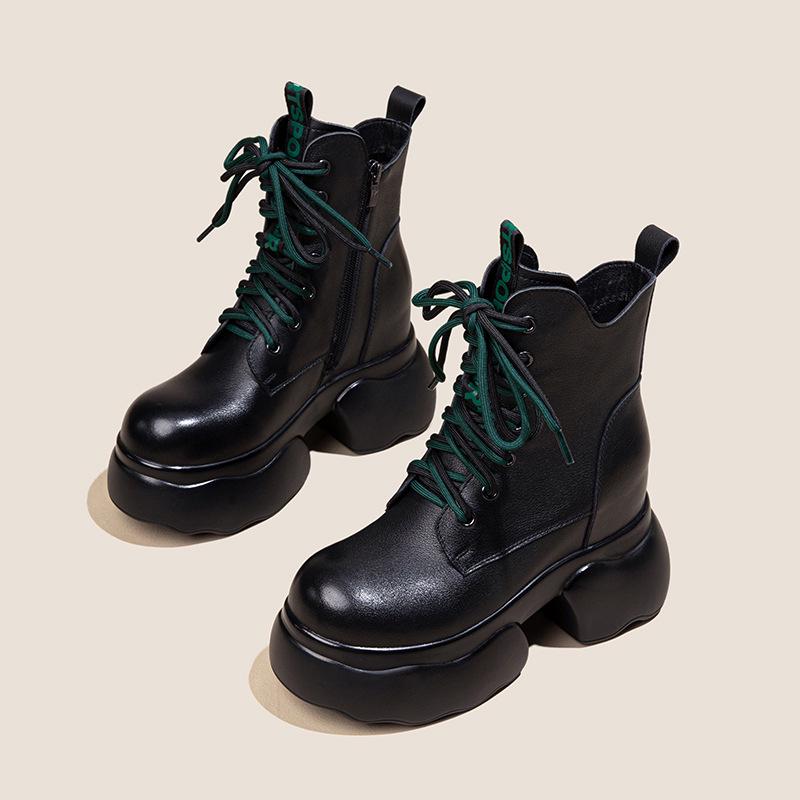 Women's Genuine Leather British-Style Ankle Boots - Versatile Autumn/Winter Fashion with Thick Sole and Inner Height Adjustment
