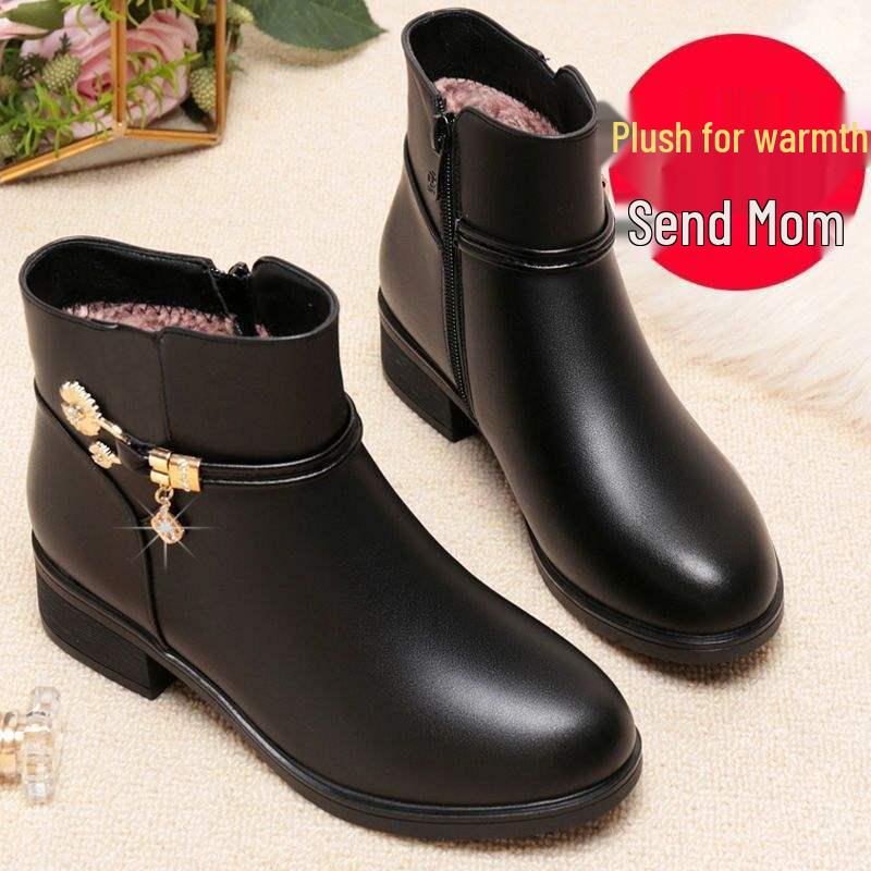 Mom's Soft Leather Cotton Shoes: Cozy Velvet-Lined Winter Boots for Women, Ideal for Middle-Aged and Elderly.