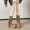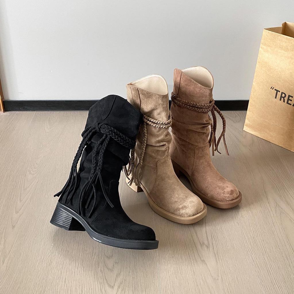 Women's Retro Chunky Heel Tassel Boots - Suede Mid-Calf Ruched Cowboy Style for Autumn/Winter