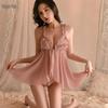 Night Fire Sexy Lingerie: Women's Passion Set with Front Buckle, Lace Camisole, Short Skirt, and Open Crotch Design.