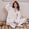 Indulge in cozy comfort with this delightful women's pajama set, perfect for autumn lounging. Crafted from rayon cotton, it offers a breathable and soft-to-touch experience. The set includes a cardigan-style long-sleeve top and matching pants, designed for a relaxed, casual fit. The playful cartoon design adds a cute and charming touch, making it an enjoyable and stylish choice for homewear. Enjoy ultimate relaxation with this comfortably chic pajama set.