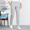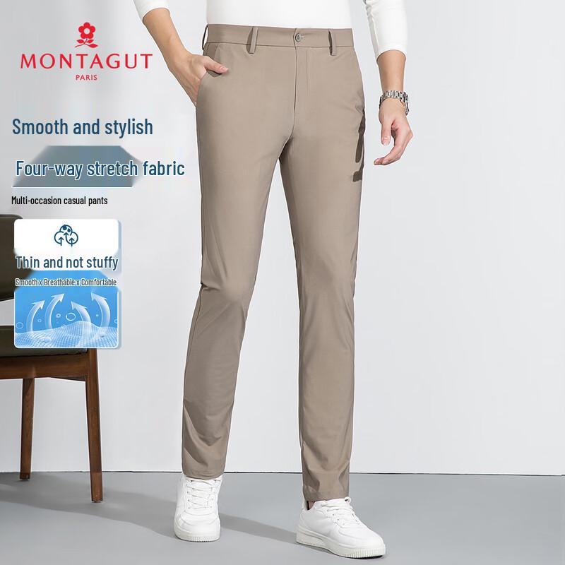 MONTAGUT Men's JG Casual Pants offer superior comfort and style for everyday and outdoor wear. These straight-leg trousers feature an upgraded, breathable, and highly elastic blend of 79.1% Nylon and 20.9% Spandex. Designed for spring and autumn, they are thin, non-iron, and have a natural waist with a zipper fly. Their simple, casual style and solid color make them a versatile addition to any wardrobe.