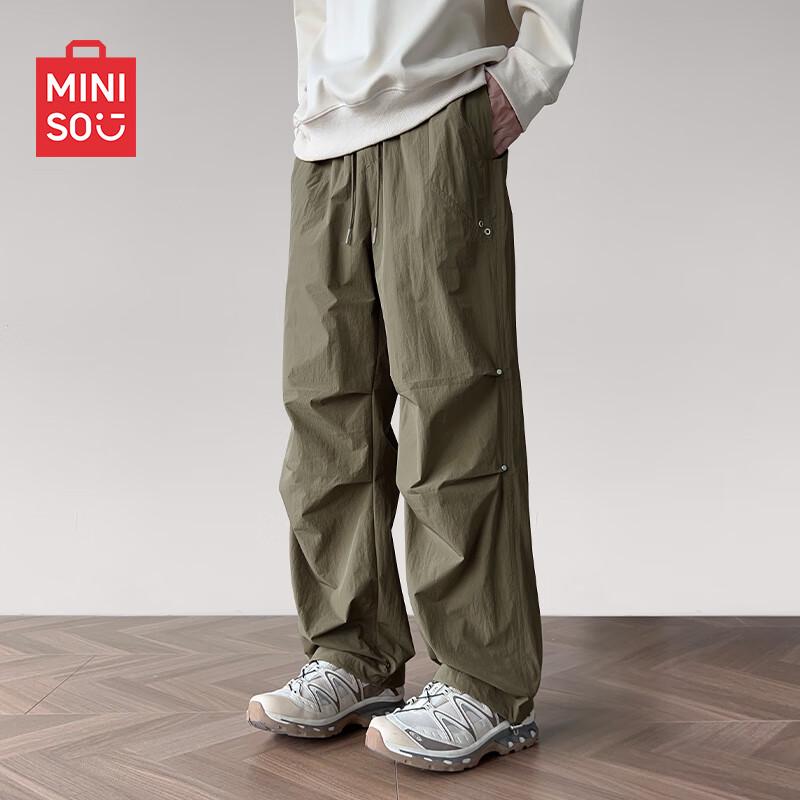MINISO Men's American Style Cargo Pants are perfect for autumn, outdoor camping, and daily casual wear. These straight-leg trousers are made from 100% polyester, offering a breathable, comfortable, and micro-elastic fit. Designed with a simple, relaxed style, they are ideal for youth and teenagers, featuring an elastic waistband and straight cuffs.