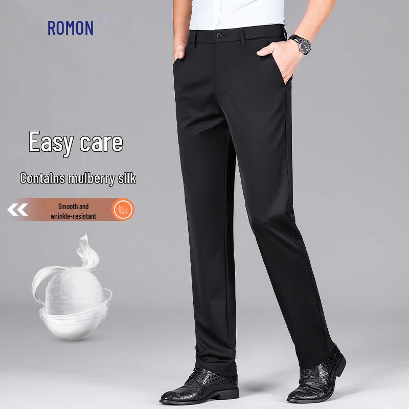 Discover the Luomeng Men's Silk Blend Business Casual Straight-Leg Pants, designed for both daily wear and professional settings. Crafted for youth and middle-aged men, these solid color long pants feature a comfortable natural waist, zipper closure, and a straight-leg fit. The fabric blend, including 1.7% mulberry silk, 60.8% nylon, 26.2% viscose, and 11.3% spandex, offers high elasticity and a thick, durable feel, suitable for all seasons. Embrace a minimalist yet stylish look with these versatile commuter and business casual trousers, perfect for the Autumn 2024 collection.