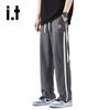 Discover the OVERPROTECTION Men's Striped Straight-Leg Wide-Leg Trousers, perfect for casual, daily, and outdoor wear in spring and summer. These fashion-forward pants feature a comfortable straight-leg, wide-leg design with a natural waist and drawstring closure. Made from 100% polyester, they are wear-resistant and easy to care for with a non-iron treatment. Details include a striped pattern, practical pockets, and stylish car seams, suitable for youth and middle-aged men seeking a blend of athletic fashion and relaxed comfort.