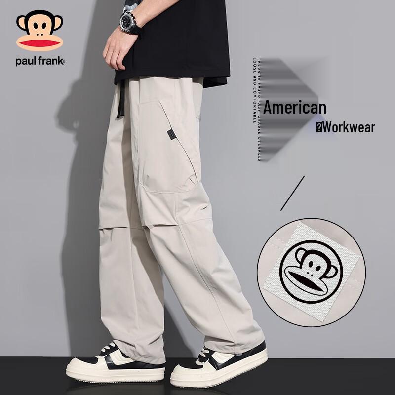 Paul Frank Men's Summer Loose Straight-Leg Cargo Pants. Crafted from 100% polyester, these thin American-style workwear pants offer a relaxed fit, straight leg, and drawstring closure for ultimate comfort. Perfect for daily wear or travel, they combine casual style with practicality. Available in various colors and sizes for youth and middle-aged men.