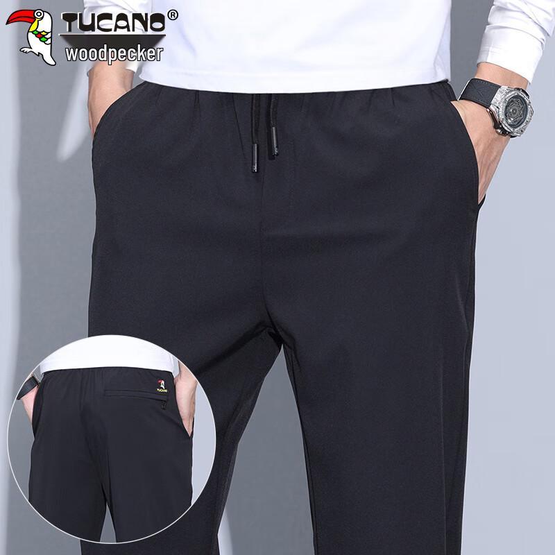 These TUCANO men's casual sports pants are designed for comfort and style during spring and summer. Featuring a loose, straight fit with a natural waist and full length, they offer slight elasticity for ease of movement. Made from a blend of polyester and spandex, these trendy trousers are perfect for various casual and athletic activities, embodying a modern Japanese/Korean fashion style. They come with a drawstring closure and regular thickness.