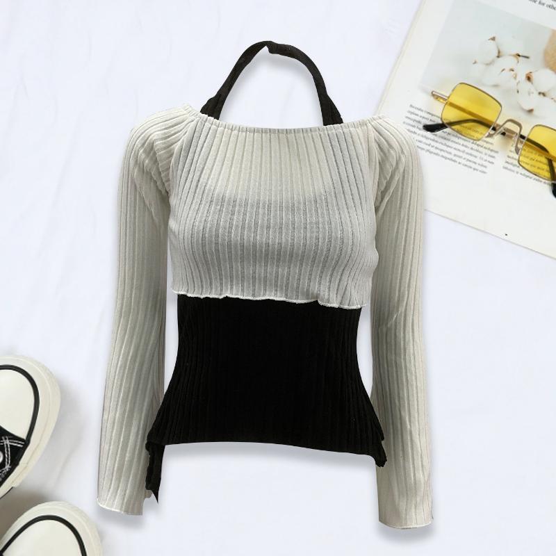 European and American women's long sleeved contrasting color two piece Y2K hanging neck knitted slim fit top