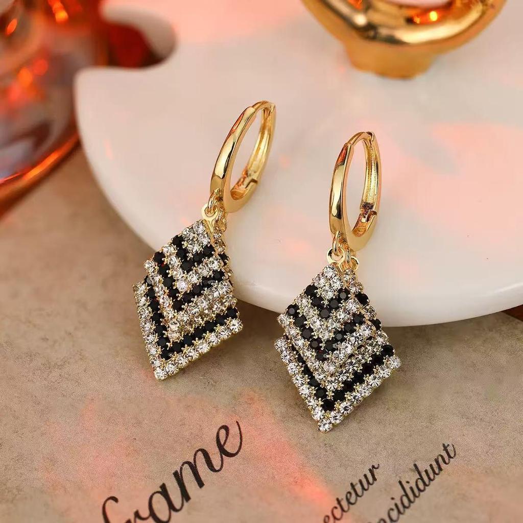 Evropské a Americké Retro Černobílé Diamantové Kosočtvercové Náušnice: Stylové, zeštíhlující obličej, Dlouhé klipy.