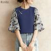 ZANZEA Women Casual Print Splice Short Sleeve Loose V-Neck Blouse