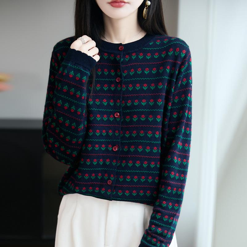Dámský žakárový barevně blokovaný kardiganový svetr s kulatým výstřihem a dlouhým rukávem na podzim 2025