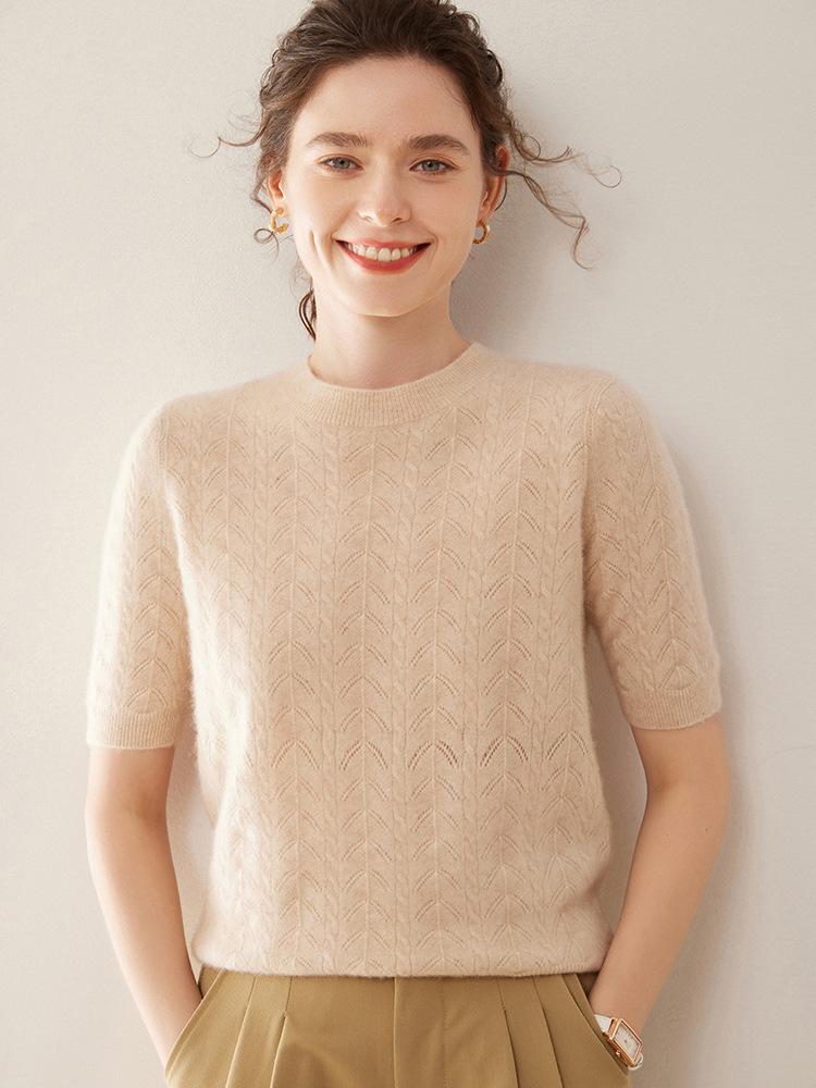 Women's Short Sleeve Round Neck Cashmere Sweater - Thin, Solid Color, Versatile Knit