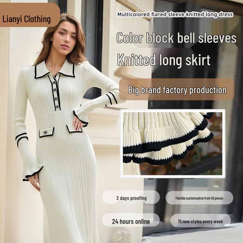 Embrace the cozy elegance of the Autumn/Winter Women's Colorblock Knitted Dress, designed for style and comfort in the cooler months. This waist-hugging, long-sleeve dress features a sophisticated turn-down collar and a trendy colorblock pattern that adds a modern twist to your wardrobe. Crafted from high-quality polyester fiber, it offers a soft, warm touch that's perfect for chilly days, ensuring you stay chic and comfortable whatever the occasion.