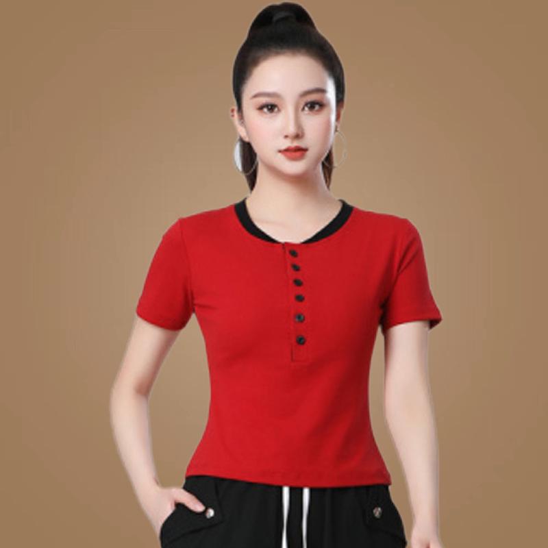 Experience comfort and style with this versatile women's t-shirt, perfect for the summer season. Crafted from soft and breathable cotton, this fashion top features a slimming design that effortlessly flatters your silhouette. The round neck and button-down front add a touch of elegance, while the short sleeves make it ideal for warm weather. Whether you're heading to a dance class or a casual outing, this t-shirt offers a chic and comfortable choice for any occasion.