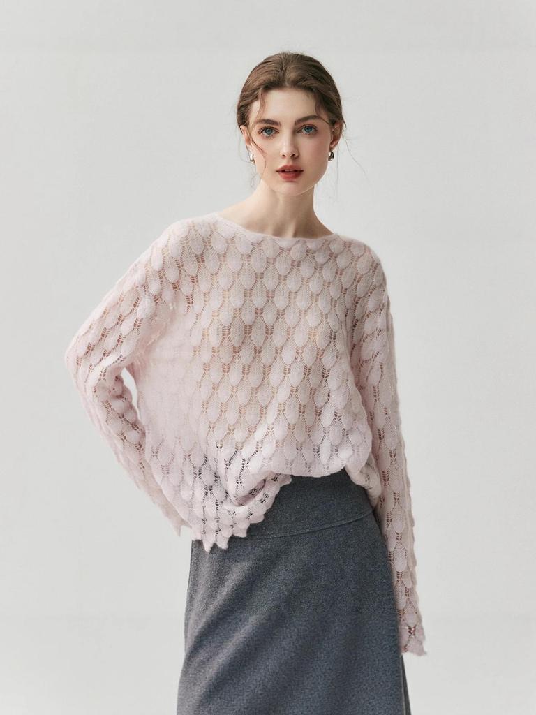 Hollow-Out Feather Design Women's Cashmere Knitwear Top - Lightweight Spring & Autumn Sweater