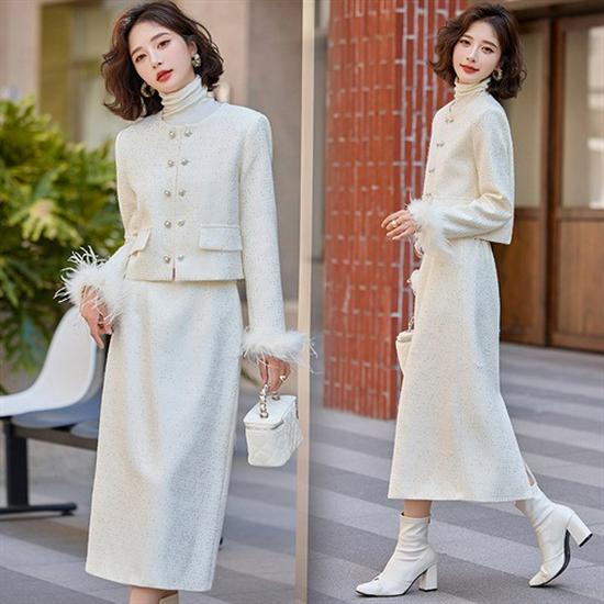 Discover elegance with this high-end women's fashion set, featuring a stylish jacket and a coordinating midi skirt. Crafted from premium polyester, this set offers a luxurious feel and comfortable fit. The jacket is adorned with exquisite bead decorations, adding a touch of sophistication to your ensemble. Perfect for any occasion, this ensemble is designed to make a statement while providing timeless style and versatility.