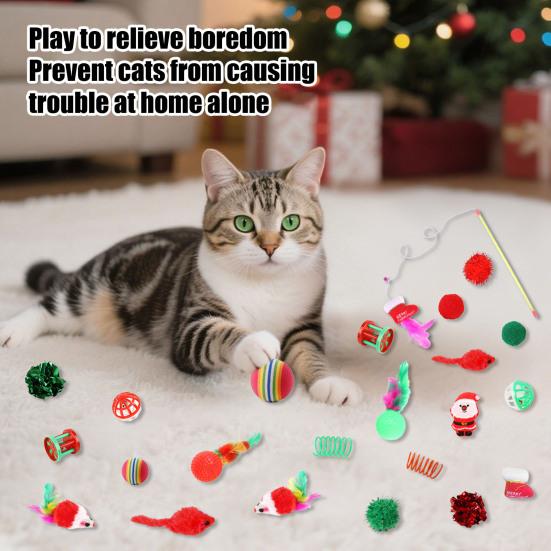 Vícedílná sada s dobrou hodnotou za peníze: Sada vánočních hraček pro kočky do interiéru, která obsahuje kočičí mávátko, pružinové hračky, míček z peří, plyšovou myš, kuličky s šustivým papírem, dýňový míček se zvonkem, sloupkové zvonky, hračky s catnipem, soba a hračku vánoční punčochu a další.