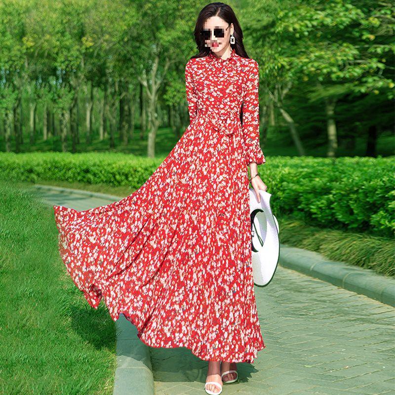 Floral Chiffon Long Sleeve Maxi Dress for Women - Spring/Autumn Slim Fit